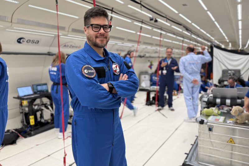 Dr. Turnock: It wasn’t until I was sitting in front of the experiment in the air with my medical student, surrounded by the other research teams, that it all became very real. I had heard many accounts of weightlessness before, but nothing quite prepares you for experiencing it yourself. It is an intense experience. Before and after each parabola, the aircraft experiences 1.8 g, so every part of your body feels twice as heavy. Then, virtually instantaneously, you feel no gravity at all, and every limb is suddenly floating in the air.